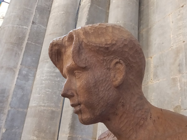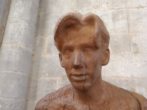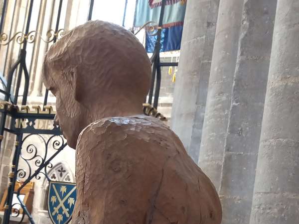 St. Peter is located inside Peterborough Cathedral, near the great west door. The Cathedral was dedicated to St Peter and encircled by a barrier known as a burgh; as a result, the town that surrounds the abbey became known as Peter-burgh. The sculpture carved by Simon Latham, resident artist at Peterborough Cathedral between May-December, 1991. The sculpture was a gift from Sir Stephen and Lady Hastings and was carved from a piece of oak from the Milton Estate.