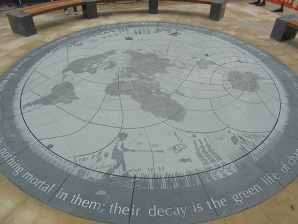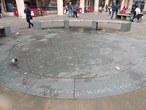 Local schools were given the opportunity to create poems, and the best of them were cast into a bronze strip that is encased within the seats surrounding the floor design.