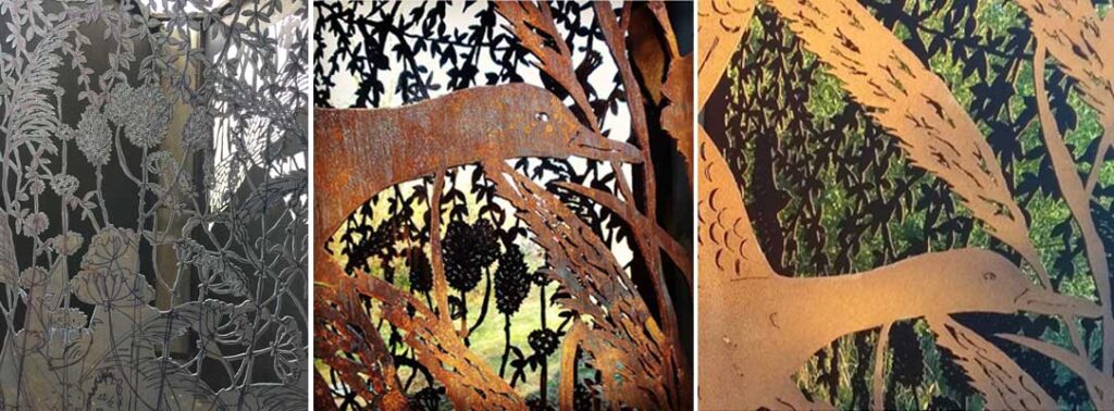 I asked Jeni the background of her artwork and how she came about with the concept. This was her reply, “Nene Park contacted me with the idea of having me make a sculpture for the park, so we had a wander around and looked at a few potential locations. I liked this location because there was a meeting of three paths leading in different directions, and there was a triangle space with nothing but grass. So this started my idea for a three-sided sculpture depicting different elements of the park. The three images I chose to create in corten steel were as follows: Dragonflies around the water’s edge with reeds, bulrushes, flag iris, flowering rush, newts, etc. wild flowers, hedgerows, trees, and birds that frequent the park. Then geese and herons take flight, surrounded by wetland. These images I have cut out of steel so they have a filigree look. I want to express the resilience of nature and yet the delicacy that we need to protect. The grey folded corners of the sculpture represent man’s containment of nature and impact on the nature that we control and also destroy.”2