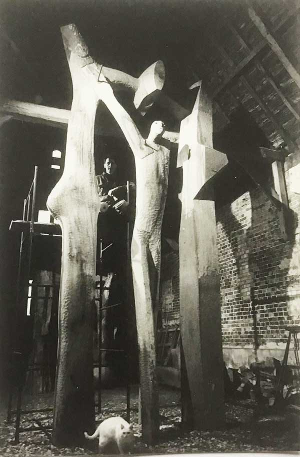 The original sculpture seen here at Lee Grandjean’s workshop before being installed in its current site at Thorpe Meadow Park in 1988. This site-specific piece on the Parkway side of Thorpe Meadows align the front of Peterborough Cathedral and the city centre. A 13ft high figure made of Oroko wood and pegged together, goes through a gateway construction, though this is commonly misunderstood as people speed by in their cars.